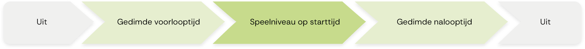 Laat je verlichting vanzelf meelopen met de planning. Vlak vóór aanvang van een reservering kan het licht kort voorschakelen op een veilig, gedimd niveau; op starttijd gaat het naar het ingestelde speelniveau. Na afloop volgt een korte naloop (weer gedimd), waarna het licht automatisch uit gaat.